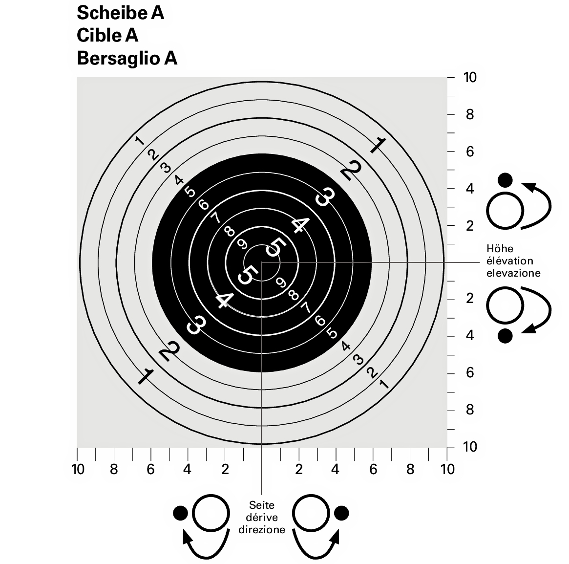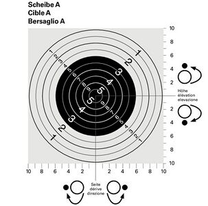 Die Symbole bei den Korrekturschrauben stellen die Scheibe (grosser Punkt) und die Schusslage (kleiner Punkt) dar. Der Pfeil zeigt die Drehrichtung der Korrekturschraube. Eine Raste korrigiert den Schuss auf 300m um 4,5cm - Bei Schusslage tief wird die Höhenkorrekturschraube im Uhrzeigersinn (rechts) gedreht. - Bei Schusslage hoch wird die Höhenkorrekturschraube im Gegenuhrzeigersinn (links) gedreht.