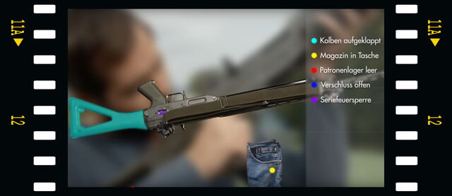 Nach Beendigung eines Schnellfeuers, beziehungsweise beim Einzelfeuer nach jedem Schuss, muss dieWaffe entladen (Magazin entfernt, Verschluss offen) mit Lauf in Richtung Scheibe auf die Ladebank abgelegtwerden.